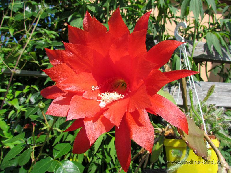 <div class=ru><p>Во время цветения он вызывает возгласы восхищения даже у мужчин, которые на большинство наших цветуёчков смотрят снисходительно, но спокойно :). Действительно, такое блюдце, растущее из скудной зелени, видной на заднем плане, впечатляет особенно. Кстати, из того, что там видно, половина — это не он, а другой кактус, который непонятно как залез в этот горшок.</p><p>Дата фото: <time itemprop=dateCreated datetime=2011-0711>11.07.2011</time></p><p><span class=ubcl>род эпифиллюм Epiphyllum</span></p></div><div class=en><p>When the flower is open, it gets vows of admiration even from males who usually are positive, but calm to all our botany. Indeed, this sausage is especially impressive when viewed in contrast with the scanty greenery it`s growing out of — you can see it in the background. By the way, only half of what you see in background belongs to this cactus, the rest is another cactus which got into this pot somehow without my help.</p><p>Photo taken on Jul 11, 2011</p><p><span class=ubcl>genus Epiphyllum</span></p></div><hr style=clear:both;><p class=ubcf><span class=ubcl>род эпифиллюм  | genus <a href=http://undina-bird.ru/Galleries/tabid/56/SearchID/60/Default.aspx?SearchText=(%20Epiphyllum%20)>( Epiphyllum )</a> — сем. Кактусовые  | Cactus family <a href=http://undina-bird.ru/Galleries/tabid/56/SearchID/60/Default.aspx?SearchText=(%20Cactaceae%20)>( Cactaceae )</a> — порядок Гвоздичноцветные  | order <a href=http://undina-bird.ru/Galleries/tabid/56/SearchID/60/Default.aspx?SearchText=(%20Caryophyllales%20)>( Caryophyllales )</a> — класс Двудольные  | class Dicotyledons <a href=http://undina-bird.ru/Galleries/tabid/56/SearchID/60/Default.aspx?SearchText=(%20Magnoliopsida%20)>( Magnoliopsida )</a> — отдел Покрытосеменные  | phylum Angiosperms <a href=http://undina-bird.ru/Galleries/tabid/56/SearchID/60/Default.aspx?SearchText=(%20Magnoliophyta%20)>( Magnoliophyta )</a> — Растения  | kingdom Plants <a href=http://undina-bird.ru/Galleries/tabid/56/SearchID/60/Default.aspx?SearchText=(%20Plantae%20)>( Plantae )</a></span></p>