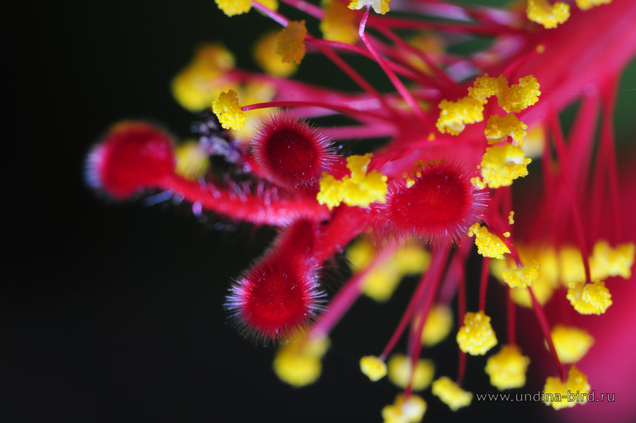 <div class=ru><p>Дата фото: 09.07.2011 | Фото Андрея Катровского<br /><a target=_blank href=http://undina-bird.ru/Portals/0/fs/20110709h2883_Hibiscus_rosa-sinensis.JPG>Смотреть больше подробностей/скачать обойный размер (1920х1275, 0,31 МБ)</a>. </p><p>Пушистое рыльце из пяти пятачков, обрамлённое множеством тычинок — будто второй ярус цветка, вынесенный на несколько сантиметров вперёд. Для чего он вынесен так далеко от лепестков с нектаром — ведь получается, что насекомые-опылители садятся «мимо» пыльцы и пестика и не могут его опылить?</p><p>Покопаемся: различные источники повторяют, что в тропиках многих мальвовых опыляют колибри — для них, кстати, наиболее привлекательны крупные цветки красного цвета. Возможно, что парящая у цветка колибри хвостом или головой елозит по пыльце и пестику? Вот тут пишут, что примерно так и есть: <a target=_blank href=http://shenthreedees.blogspot.com/2010/10/hummingbird-hibiscus-interaction.html>пыльца осыпается на голову птичке, пока она пьёт нектар</a>. А затем с головы попадает на пестик другого цветка (but how? не говорят…). <a target=_blank href=http://hoosiergardener.com/wp-content/uploads/2010/07/hummingbird-hibiscus-steve-byland-a-Fotolia_15250719_S.jpg>Вот ещё фотка</a>. Вот поэтому у тропического гибискуса такая странная форма. У мальвовых наших широт <a target=_blank href=http://undina-bird.ru/Galleries/tabid/56/galleryType/SlideShow/ItemID/894/Default.aspx?SearchText=(%20Malvaceae%20)>строение цветка похожее, но пестик и тычинки не вынесены так далеко</a>.</p><p>Правда, если покопаться дальше, то оказывается, что колибри живут в Америках, а китайский гибискус родом из Индокитая, и в природе колибри сроду не видал. В Индокитае и Индонезии есть другие птички, промышляющие нектаром из цветов — нектарницы (<a target=_blank href=http://www.besgroup.org/2010/03/03/crimson-sunbird-hovering-to-harvest-nectar/>иногда они даже парят, как колибри</a>). Однако упоминания о том, что нектарницы у гибискусов воруют вкусняшку, нисколько их не опыляя, попадаются гораздо чаще (например: <a target=_blank href=http://www.besgroup.org/2009/01/17/olive-backed-sunbird-robbing-hibiscus-nectar/>раз</a>, <a target=_blank href=http://www.besgroup.org/2007/11/18/hibiscus-and-nectar-harvest/>два</a>), чем <a target=_blank href=http://2.bp.blogspot.com/_8E2jfX9ow78/S5egKKQAR3I/AAAAAAAAARE/ick_e5j8-4c/s1600-h/birds-maurice-nagar+052.JPG>изображения</a>, где по  стечению обстоятельств птички всё-таки имеют шанс соприкоснуться с пыльцой, сидя на соседней ветке. В конце концов, <a target=_blank href=http://www.arkive.org/queen-alexandras-birdwing/ornithoptera-alexandrae/image-G34711.html>кто её поймёт</a>, эту окультуренную ботву. Может, такой длинный пестик в данном случае — это приспособление к опылению человеками :).</p><p><span class=ubcl>гибискус китайский Hibiscus rosa-sinensis</span></p></div><div class=en><p>Photo taken on Jul 09, 2011 | Photo by Andrei Katrovskiy<br /><a target=_blank href=http://undina-bird.ru/Portals/0/fs/20110709h2883_Hibiscus_rosa-sinensis.JPG>View more details/download wallpaper size (1920х1275, 0,31 M)</a>. </p><p>Fluffy five-snouted stigmas surrounded by multiple stamina — looks like a second flower, located a couple of inches in front of the main part. Why such strange construction? Looks like an insect visiting the flower to take some nectar will not get in touch with the pollen and pistil and thus it cannot pollinate the flower?</p><p>Let's see: different sources repeat that tropical Malvaceae are pollinated by hummingbirds — and, by the way, big red flowers are most attractive for them. Maybe a hummingbird hovering above a flower will fetch the pollen on it's head and tail? Here they say how it's happening: <i><a target=_blank href=http://shenthreedees.blogspot.com/2010/10/hummingbird-hibiscus-interaction.html>pollen sticks to its head, while the bird feeds on nectar</a>. This pollen is carried to the next hibiscus flower and contacts the stigma</i> (but how? no info…). <a target=_blank href=http://hoosiergardener.com/wp-content/uploads/2010/07/hummingbird-hibiscus-steve-byland-a-Fotolia_15250719_S.jpg>Here is another photo</a>. That's why tropical hibiscus has such interesting form. In our latitudes Malvaceae <a target=_blank href=http://undina-bird.ru/Galleries/tabid/56/galleryType/SlideShow/ItemID/894/Default.aspx?SearchText=(%20Malvaceae%20)>look similar, but the pistil is shorter</a>.</p><p>Well, if we look at it again, we'll see that hummingbirds are native to Americas while the Chinese hibiscus is native to China and Malaysia. Thus, originally they have nothing to do with 