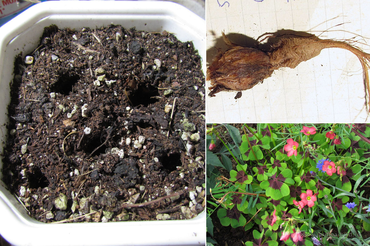 Вообще кислицы я до поры считала просто… ну… травой. Но, выдёргивая их осенью и зимой, я обнаружила, что под основнрй клубнелуковицей у них есть ещё и большие репки. Вот на правом верхнем фото эта клубнерепка уже на полпути к окончательному сморщиванию, а вообще осенью она раза в 3 больше — я б показала, но во время Великой осенней выкопки нам не до фоточек. И вот эта репка не просто усыхает, она при этом сильно сокращается в длину — на фото видны поперечные складки. Затем репка окончательно усохнет в маленький сухой хвостик, а луковица — вжжжух! — окажется на зиму глубоко под землёй.